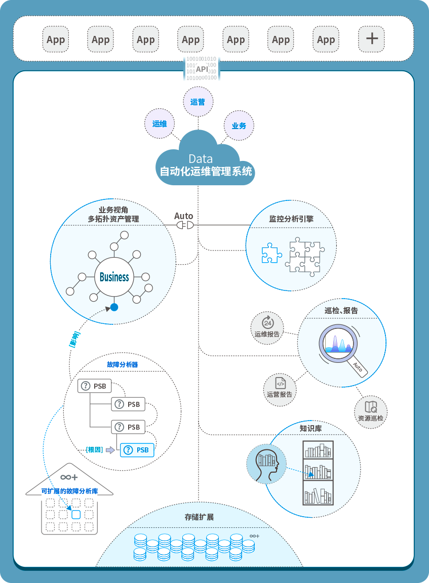 Data开放性的故障分析器机制,让客户的运维管理人员经过简单的平台API学习即可开发出满足企业自身业务需求的分析器,而Data在底层为其提供丰富的数据支撑。