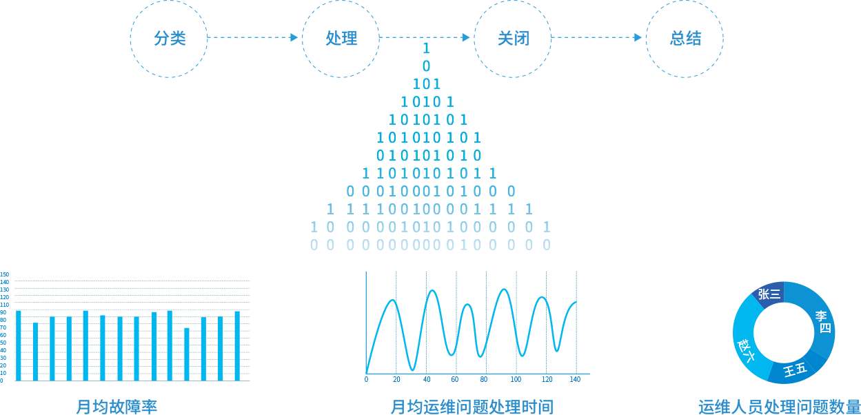 运维过程的流程化是运维运营过程的管理手段,Data提供了平台层的支撑,每一个运维问题都可以在线的完成问题的分发->处理->关闭->经验总结;系统的拥有者从中可以看到问题的发生率、中断时间、各运维人员的问题处理效率、工作绩效等统计分析数据,帮助团队不断的进行效率提升。