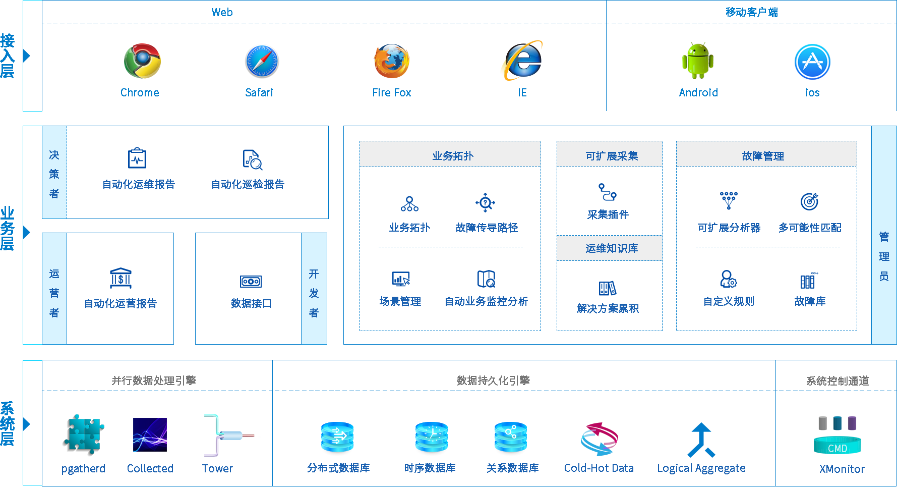 Data的系统监控涵盖了数据中心系统方方面面的性能、容量、环境、故障等运维指标;以及业务的使用率、频次等运营指标;甚至可以和客户业务程序进行深度的集成完成业务数据本身的监控和统计分析;
