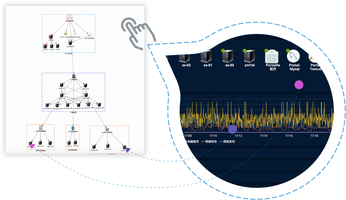 数据中心是一个非常复杂的系统,系统内的各个资源之间存在着错综复杂的关系,Data通过数据关联分析技术,和强大的资产拓扑管理能力将监控数据和业务自动的关联起来,在如此复杂的系统中系统管理员仅仅需要简化的操作就可以获得业务层级点全景监控信息,这种体验对于系统管理员来说简直就是“上帝模式”一样;