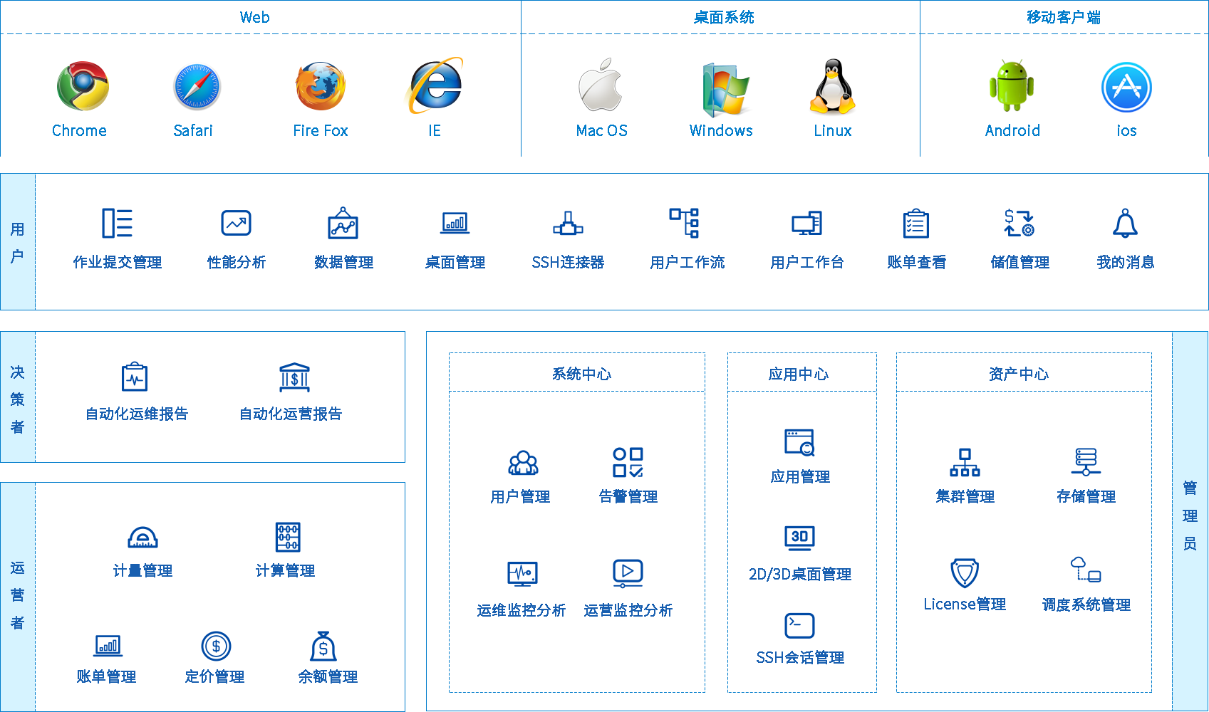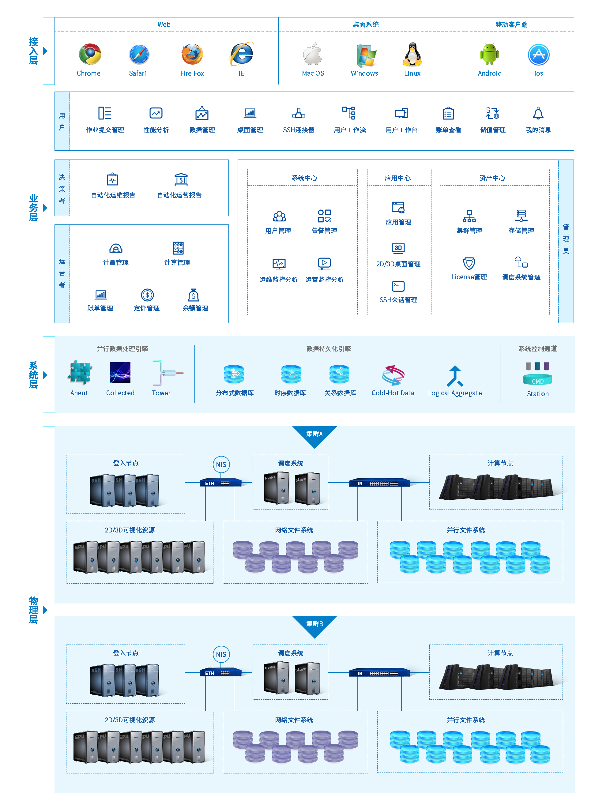 应用服务门户(Portal)集成了集群管理软件、操作系统、调度系统、认证系统、存储系统、网络存储系统和DCV系统,便于管理和维护集群资源和调度资源,实现系统化的管理、权限化的分配调度资源、一体化的认证和全景化的监控存储资源的使用情况,为企业提供一站式的业务交互管理体验。