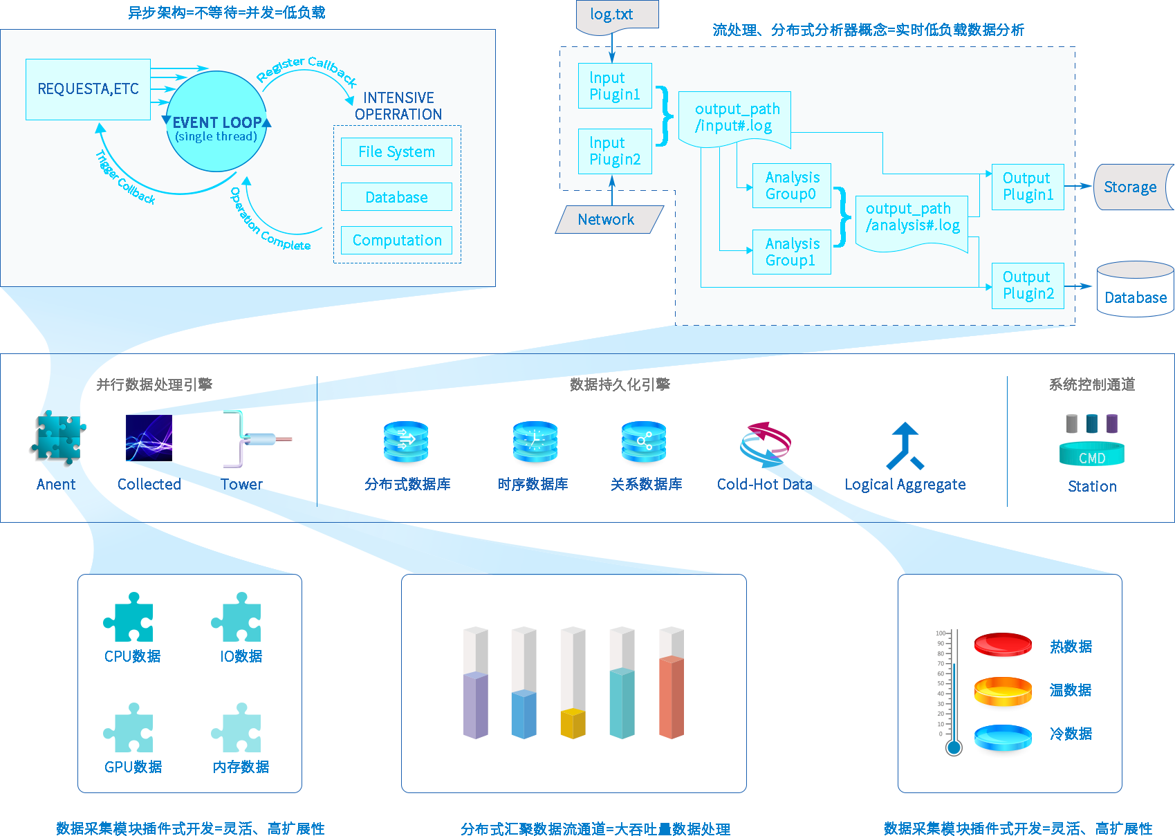 数据处理层应用了自主研发的云数据处理引擎:它采用了插件式的采集组件、流式的数据处理模块、和满足不同场景要求的实时关系型数据库、时序型数据库、大规模并发访问的分布式数据库,以及数据的冷热区分处理策略,保证了数据中心海量数据高效而正确的存储。